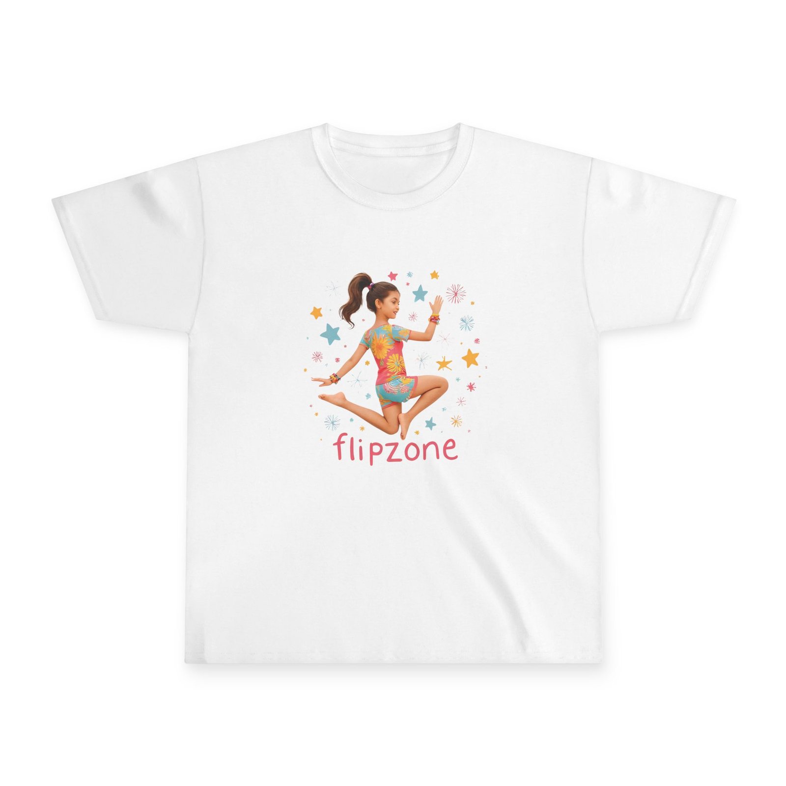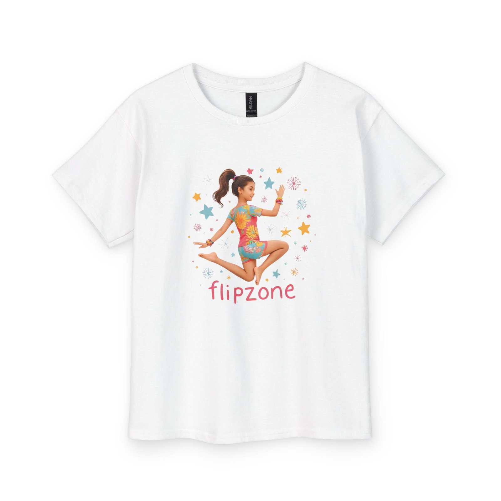 Light, playful, and made for movement — this youth cotton tee celebrates little gymnasts and backyard acrobats. The soft, slightly vintage-feel fabric drapes comfortably while a colorful illustration of a leaping gymnast and the friendly “Flipzone” wordmark bring energy to every day. It’s a go-to top for class, practice, or running around with friends — breathable enough for warm afternoons, sturdy enough to stand up to lots of washes, and cut to a regular fit that lets kids climb, stretch, and flip without restriction. The tear-away label keeps the neck comfortable during long practices, and the ribbed collar and taped shoulders help the tee hold its shape through frequent wear.
